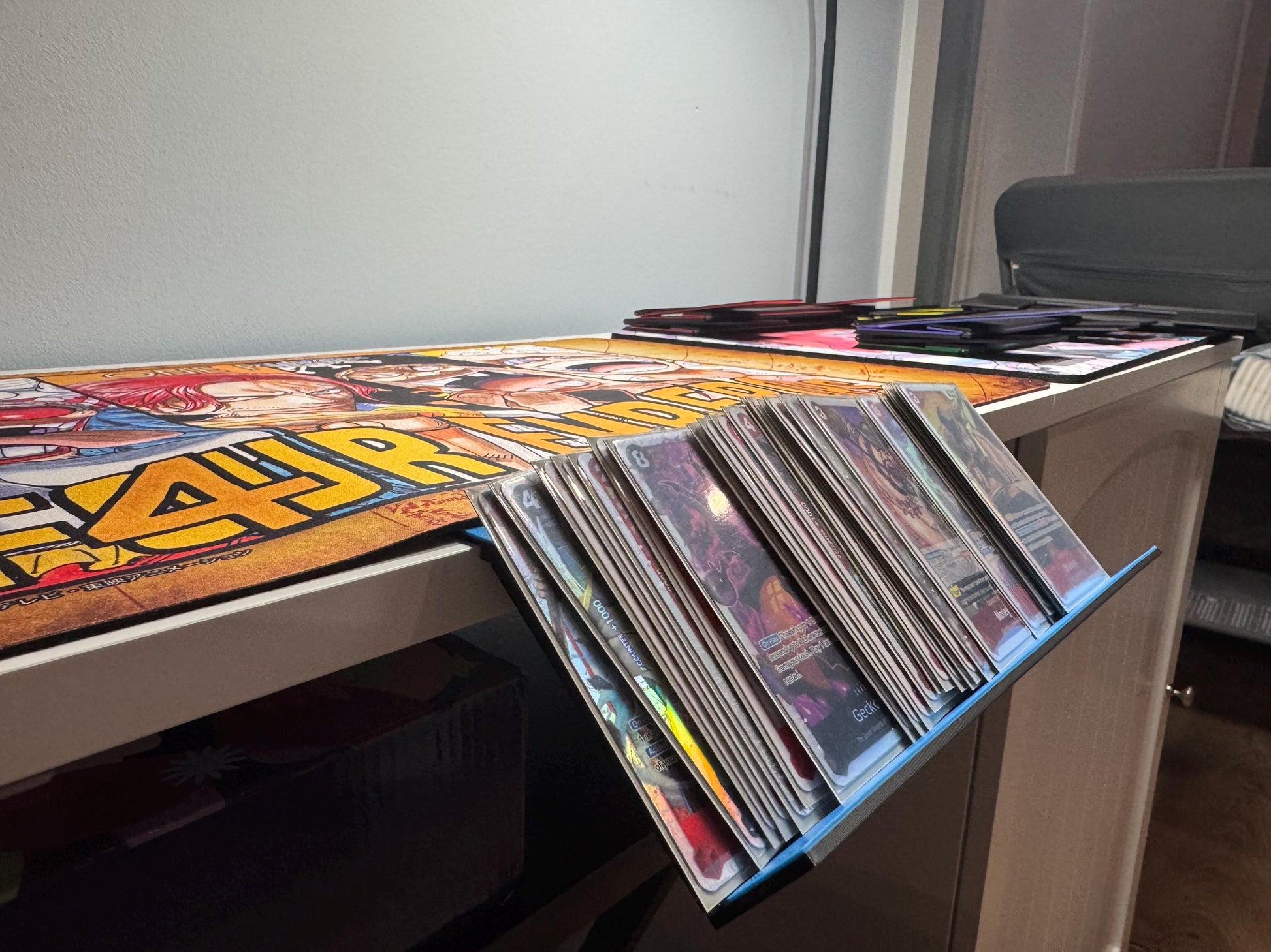 This card holder is foldable and easily portable. Once opened, the top portion slides under your playmat, then the bottom portion folds out to place your cards onto.